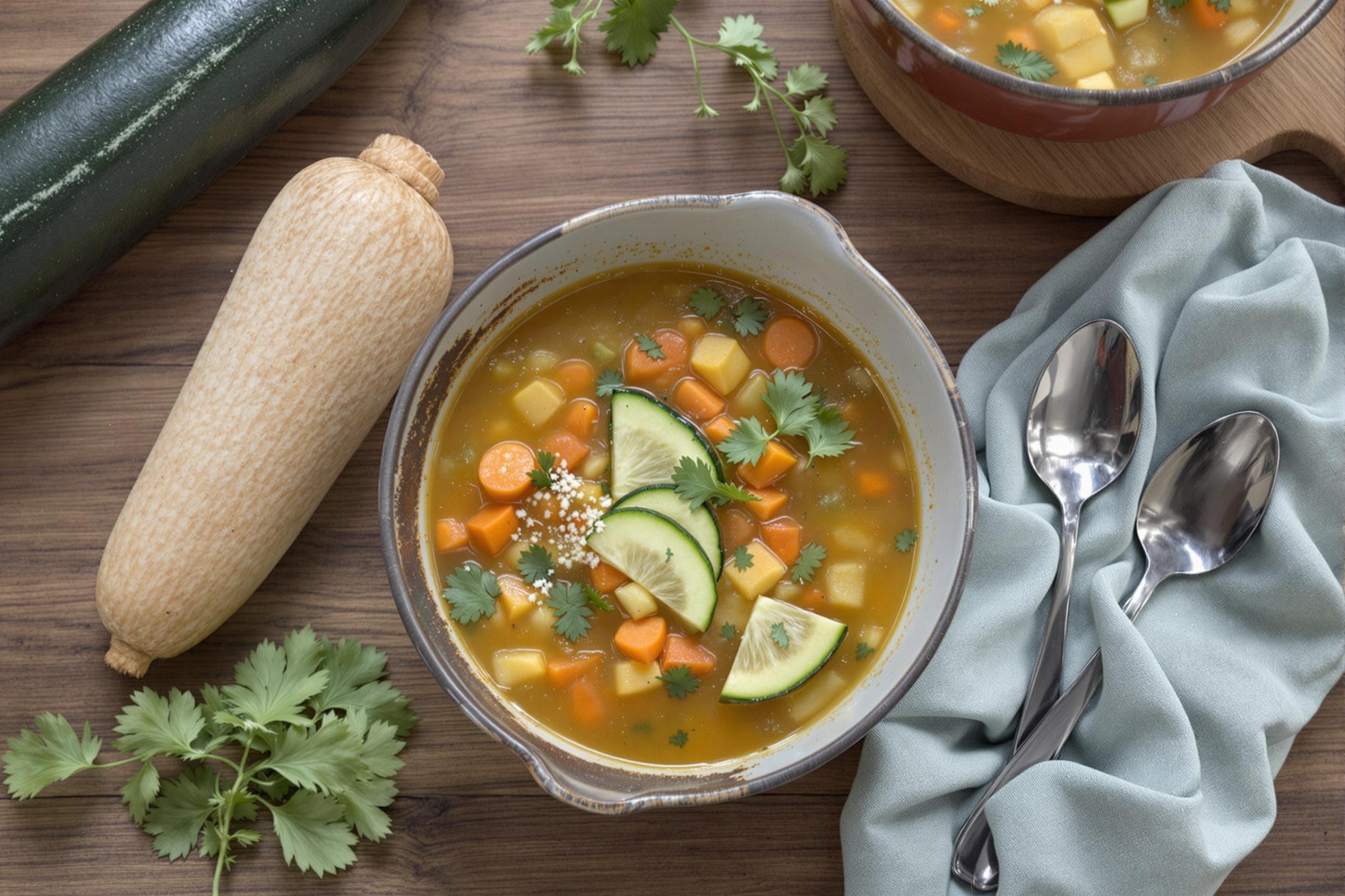 1. Courgettes : Légume d’été, riche en eau et en vitamines (notamment la vitamine C), elle apporte une texture douce à la soupe.